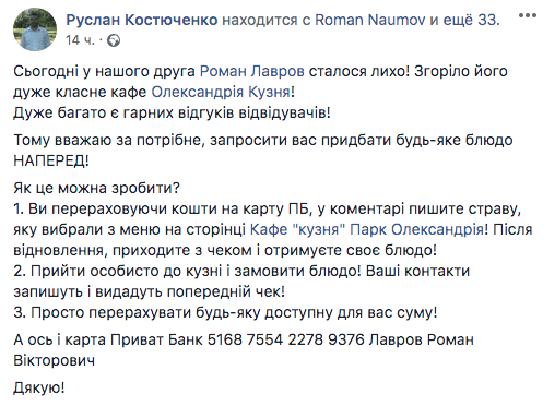 Сьогодні у нашого друга Роман Лавров сталося лихо! Згоріло його дуже класне кафе Олександрія Кузня!